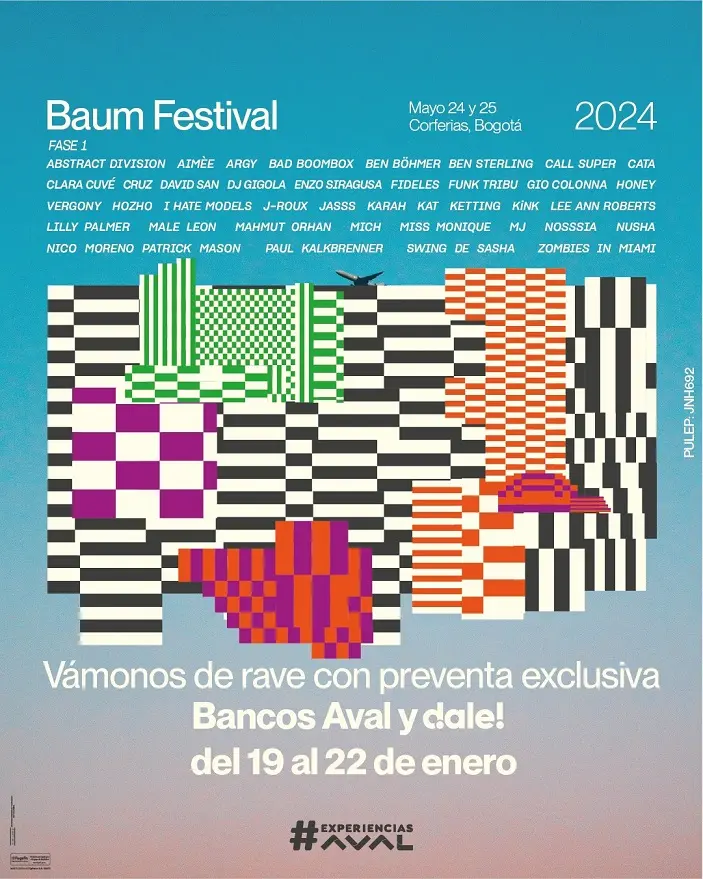 Separa tu lugar en la pista de baile de Baum Festival con la preventa exclusiva para los clientes de los Bancos Aval (Bogotá, Occidente, Popular y AV Villas) y billetera digital dale! desde el viernes 19 de enero a las 10:00 a.m. hasta el lunes 22 de enero a las 8:59 a.m. cuando se habilitará la venta con todos los medios de pago. Entradas en ETicket.co.