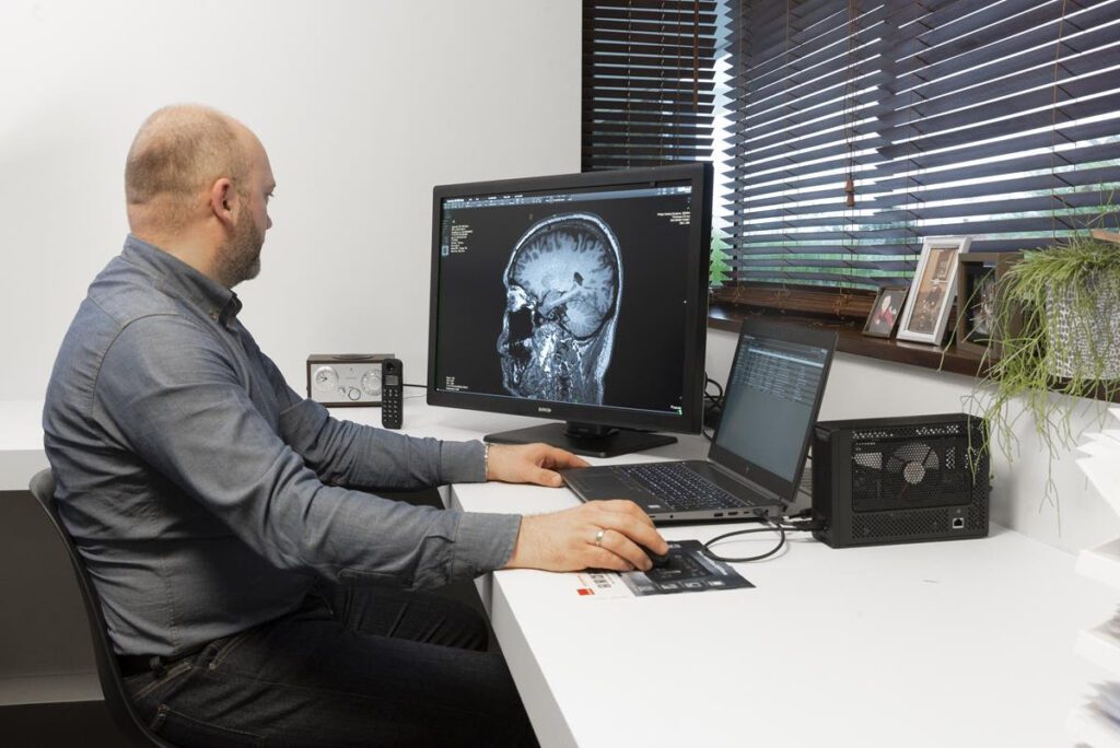 La lectura en casa en una práctica cada vez más común en la radiología, por lo cual el Dr. Samuel Kettenhoken médico radiólogo del Hospital Tecsalud, quien cuenta con una estación de trabajo en casa menciona que “las tecnologías de Barco garantizan una calidad de imagen inigualable, y permiten realizar un diagnóstico oportuno. En cuestiones de productividad, el trabajo remoto me brinda la oportunidad de realizar interpretaciones desde la comodidad de mi hogar, con la fiabilidad de que no estoy sacrificando la calidad de imagen por hacerlo de manera remota, lo cual ofrece mayor tranquilidad en el diagnóstico”.