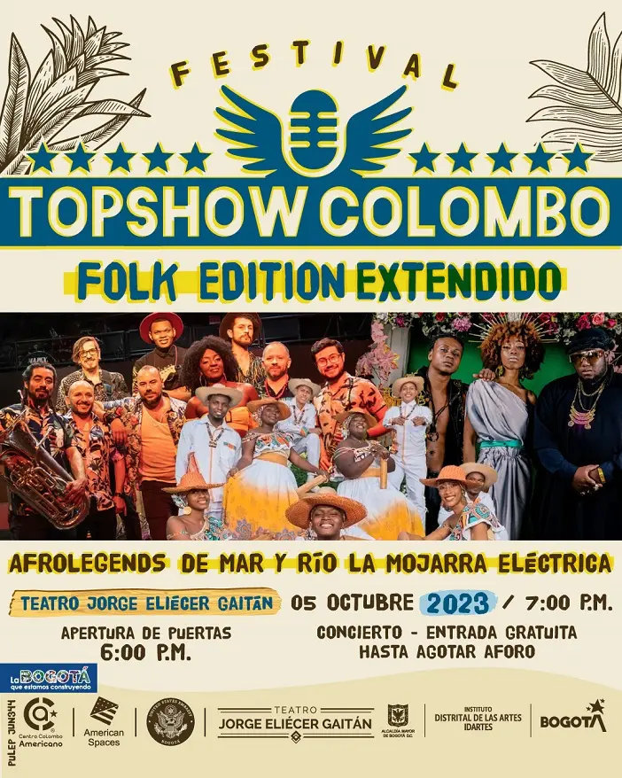 Ahora llega el Top Show Colombo Extendido que forma parte del festival Top Show Colombo, “En esta oportunidad traemos tres grandes agrupaciones, seleccionadas de la convocatoria nacional de bandas del Festival y representativas del folclor del Pacífico y del Caribe colombiano: La Mojarra Eléctrica, De Mar y Río y Afrolegends que se presentarán el próximo 5 de octubre en el Teatro Jorge Eliécer Gaitán en un concierto gratuito para el público capitalino”, indica Maricela Vélez, directora Cultural del Centro Colombo Americano.