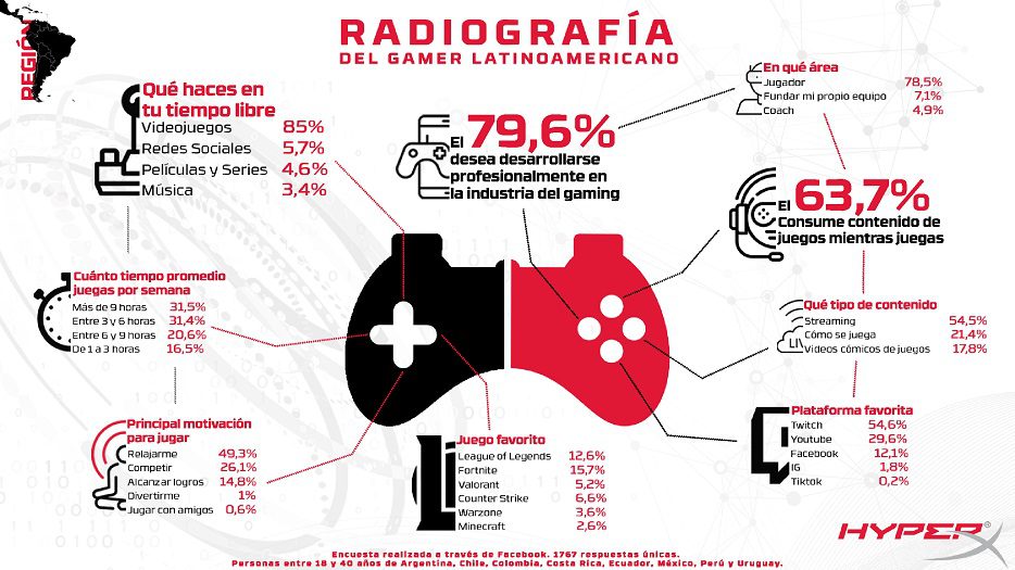 De acuerdo a una encuesta impulsada por HyperX, el equipo de periféricos para videojuegos de HP Inc. y la marca líder en videojuegos y esports, el 79,6% de los gamers desea desarrollarse profesionalmente en la industria del gaming, una cifra que refleja el crecimiento a futuro que tendrá este sector. La encuesta, realizada a través de redes sociales entre los seguidores de América Latina, fue respondida por 1767 personas de ambos sexos entre los 18 y 40 años de edad.