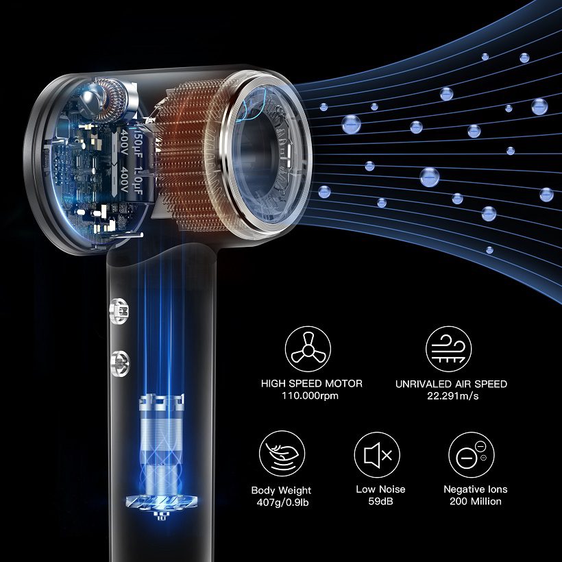 Laifen usa un motor sin escobillas, muy parecido al Dyson Supersonic, pero a la mitad del precio y con un sistema multiplicador de aire de alta velocidad de secado más rápido y silencioso. Laifen cuenta con un motor de aleación de aluminio de grado aeronáutico sin escobillas que gira a 110 000 revoluciones por minuto para lograr una velocidad de aire y un volumen de cabello inigualables, sin dejar de ser suave con el cabello delicado. El diseño iónico avanzado de Laifen con 200 millones de iones negativos realza el brillo y reduce el encrespamiento y la electricidad estática para obtener resultados rápidos y hermosos, secando el cabello rápidamente en un promedio de solo cinco minutos; y con una vida útil de 1000 horas, proporcionará años de uso.