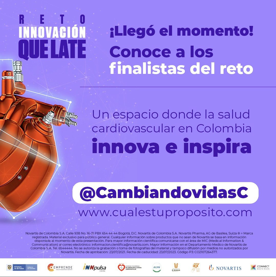 Los 10 finalistas del “Reto de Innovación Que Late” son: GENOMA CES – Universidad CES, NETUX, SALUDTOOLS, Fundación Universitaria Sanitas, NI MEDICAL, Fundación ABOOD SHAIO, LUSEED VASCULAR LTD, CARDINALTECH COMPANY SL, Procesos Inteligentes LTDA, y Universidad de la Sábana. Este reto de innovación abierta es una iniciativa que nació a comienzos del año gracias al trabajo de diferentes entes públicos y privados como INNPULSA, Sociedad Colombiana de Cardiología, Asociación Colombiana de Medicina Interna, Universidad El Bosque, CONNECT Bogotá Región y Novartis.