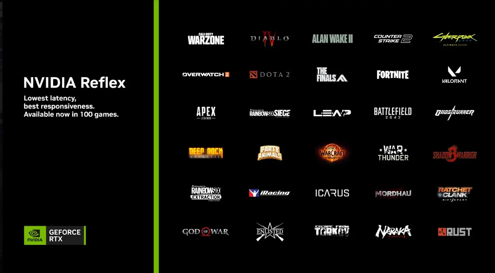 Desde su debut en septiembre de 2020, más de 100 juegos se han lanzado con o han añadido soporte para NVIDIA Reflex. Es una lista estelar que incluye Apex Legends, Call of Duty: Modern Warfare III, Call of Duty: Warzone, Counter-Strike 2, Fortnite y Overwatch 2, junto con juegos de éxito aclamados por la crítica como Cyberpunk 2077, The Witcher 3: Wild Hunt, Diablo IV, Remnant 2, God of War, Microsoft Flight Simulator, Red Dead Redemption 2, Ratchet & Clank: Rift Apart, Marvel’s Spider-Man Remastered y muchos más.