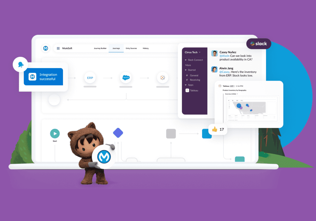 - Slack-First MuleSoft. Integra múltiples aplicaciones empresariales directamente en Slack, eliminando la necesidad de navegar entre diferentes software y sistemas. Las nuevas capacidades permiten a los usuarios conectar aplicaciones y datos a Slack con clics, en lugar de código, e incluir alertas automatizadas a sus flujos de trabajo.